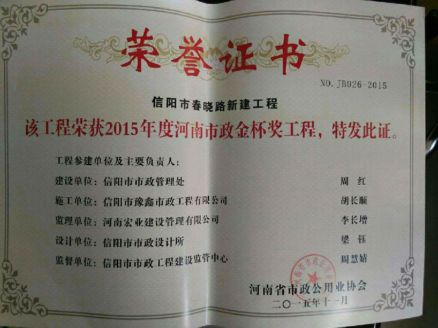 好風憑借力,送我上青云。近年來,公司積極參與城市市政基礎(chǔ)設施建設施工,積極參與市場競爭,先后承擔施工了市政府重點工程南京路道路改造工程、春曉路道路改造工程,東方紅大道道路改造工程、龍江東路新建工程等重點民生工程,其中南京路道路改造工程被省建設廳評為“中州杯”, 春曉路和東方紅大道道路改造工程被省建設廳評為“省優(yōu)工程”,成為城區(qū)一道道亮麗的風景線。參與施工了市典范小區(qū)“臺北城上城”、“恒大名都”以及師范學院、職業(yè)技術(shù)學院、交警支隊和軍區(qū)道路工程,參與施工了雞公山管理區(qū)、南灣管理區(qū)、明港鎮(zhèn)和羅山縣等部分道路小區(qū)工程施工,累計大小各類施工工程三百余項,企業(yè)影響力不斷擴大、輻射力不斷增強,市場份額不斷提高,企業(yè)信譽不斷彰顯,為信陽城市建設做出了積極貢獻,為企業(yè)的可持續(xù)發(fā)展插上了騰飛的翅膀。